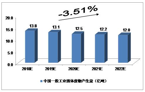 2015年,246个大、中城市一般工业固体废物产生量达19.1亿吨;2016年,214个大、中城市一般工业固体废物产生量达14.8亿吨。我们预计,2018年中国一般工业固体废物产生量将达到13.8亿吨,未来五年(2018-2022)行业年均复合增长率约为-3.51%,2022年达到12.0亿吨。