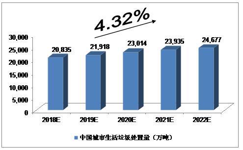 2015年,246个大、中城市生活垃圾处置量为18,069.5万吨;2016年,我国214个大、中城市生活垃圾处置量为18,684.4万吨。我们预计,2018年中国城市生活垃圾处置量将达到20,835万吨,未来五年(2018-2022)行业年均复合增长率约为4.32%,2022年达到24,677万吨。