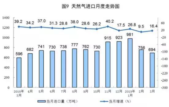 3月份,进口天然气694万吨,同比增长16.4%。1季度,天然气进口量同比增长17.8%。
