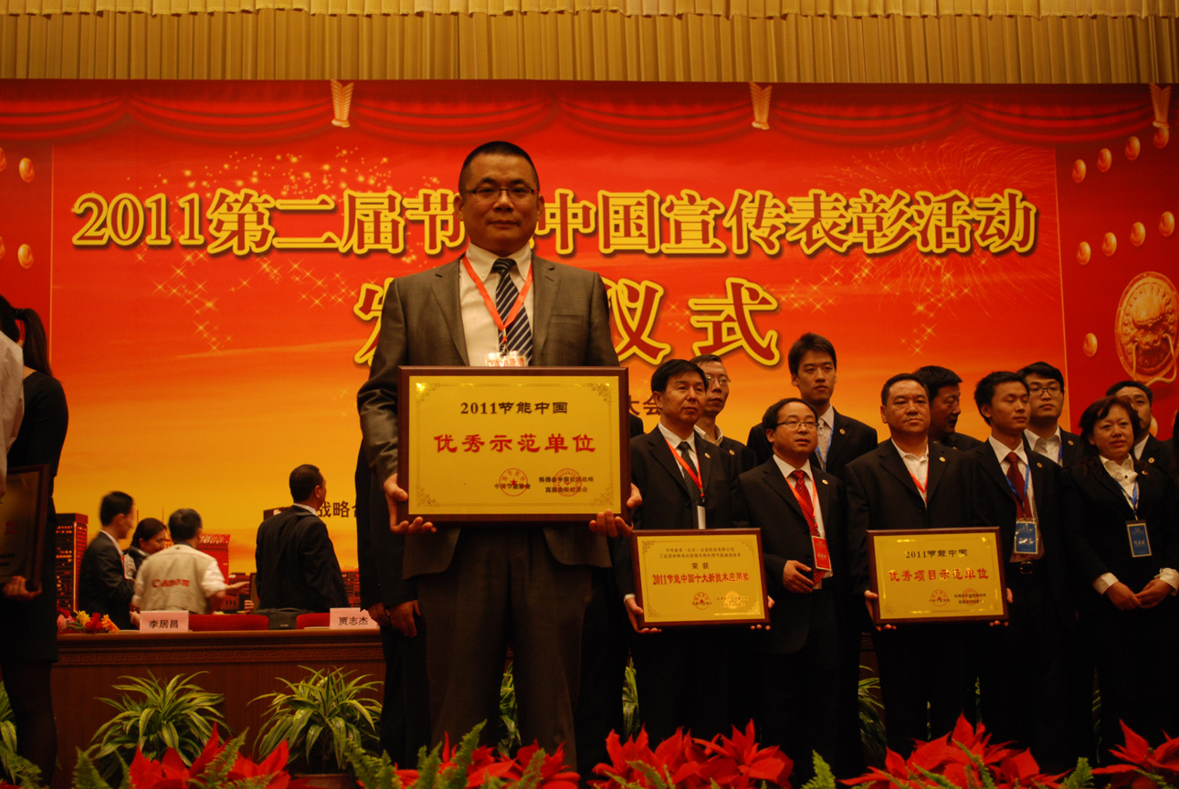 由中国节能协会、科博会中国能源战略高层论坛组委会主办的“绿色发展、节能中国”2011(第二届)节能中国宣传表彰活动发布仪式,于2011年5月19日在北京人民大会堂举行。全国近千家单位参与了活动。我司由于在实施国家节能减排、发展循环经济、致力于节能环保工作方面做出了突出贡献,而荣获“2011(第二届)节能中国优秀示范单位奖”。公司董事长郭建涛先生应邀亲临北京人民大会堂参加隆重的颁奖仪式并上台领奖。