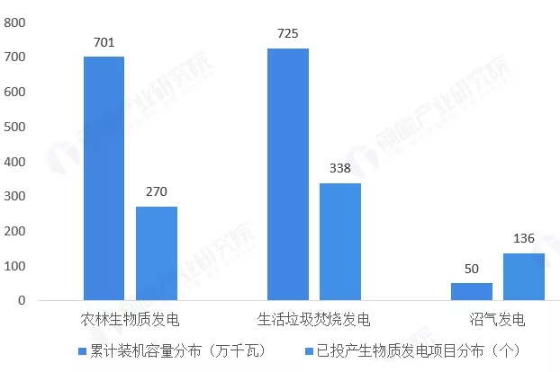 其中,农林生物质发电项目270个,累计装机容量为701万千瓦;垃圾焚烧发电项目338个,累计装机容量为725万千瓦;沼气发电发电项目136个,累计装机容量为50万千瓦。