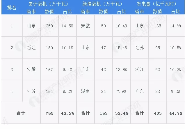 2018年中国生物质发电前四实力省市排行(单位:万千瓦,亿千瓦时)