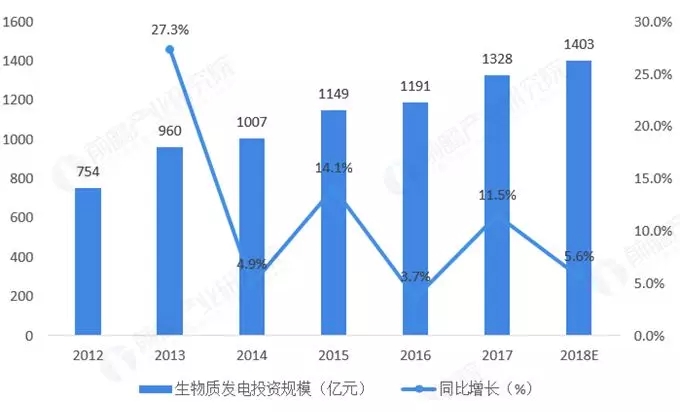 近年来我国生物质发电投资规模持续增长,虽然增速较2010年前后的30%有所放缓,但增势依然十分明显。据国家统计局的数据显示,2017年生物质发电投资规模已达到1328亿元,同比增长11.5%。2018年的投资规模或在1400亿元左右,仍然保持增长。