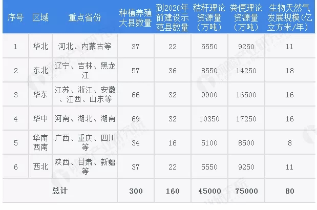 全国生物天然气建设布局中提出到2020年生物天然气示范县数量达160个,种植养殖大县数量达到300个东北地区作为农林生物质富集地区,秸秆理论资源量达到8550万吨,粪便理论资源量达到14250万吨,其生物天然气发电规模达到18亿立方米/年。