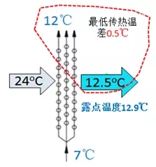 为何送风温度高于露点温度(12.9℃)盘管尚能除湿呢?那是因为相对于微小的空气分子来说,铝箔之间约2mm的空隙是比十万八千里还大的距离!所以在两片铝箔之间的空气分子的温度是分层的。靠近铝箔的温度低于露点温度(12.9℃),但是离铝箔远的空气分子温度是比送风温度(13.35 ℃)还高的,而送风温度是所有铝箔之间的空气分子的混合温度。