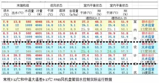 舒适性空调控制的是主机回水温度,利用选型软件数字模拟风机盘管在热负荷=额定冷量/1.2和湿负荷=0.25*热负荷的环境下的运行状态,可得表1的数据。第一条黑色虚线以上的是常规7-12℃供回水三排风机盘管,虚线以下的是9-17℃中温大温差风机盘管。特别突出的是不论是提高回水温度1℃或是缺水运行,室内平衡点相对湿度依然守恒。
