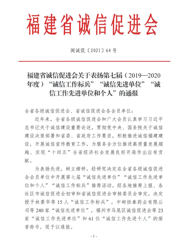 热烈祝贺公司荣获福建省“诚信先进单位(2019-2020年度)”荣誉称号