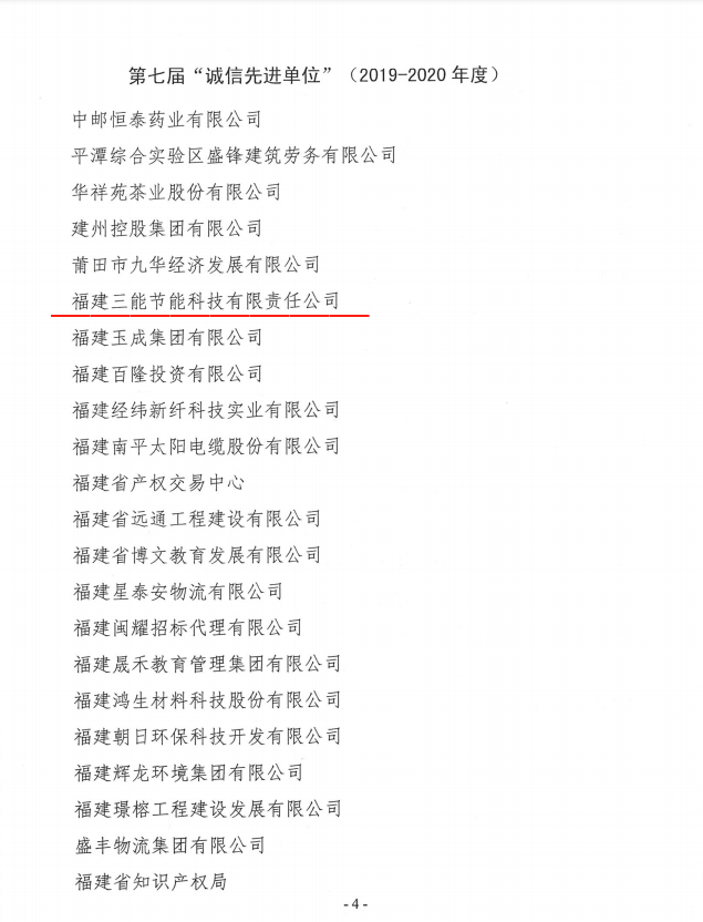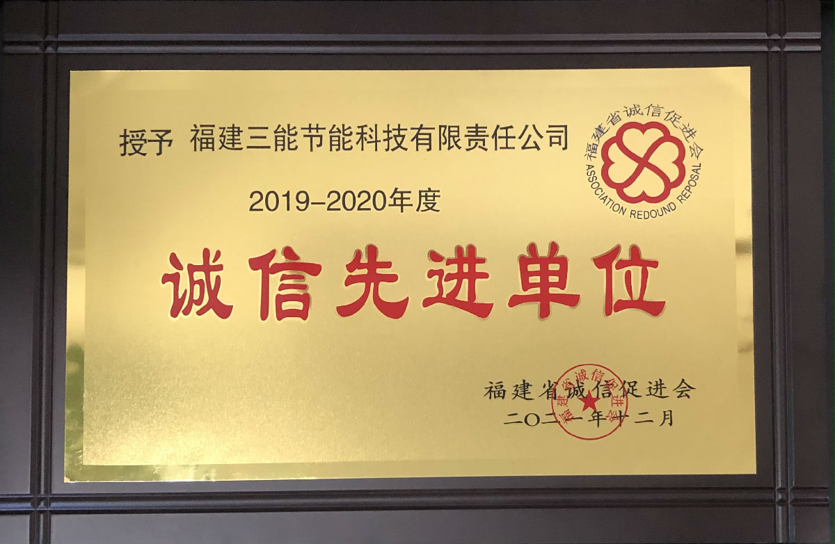 近日,三能节能科技集团在福建省诚信促进会举办的第七届“诚信先进单位”、“诚信工作先进单位和个人”、“诚信工作标兵”(2019-2020年度)评选推荐活动中荣获“诚信先进单位”荣誉称号。